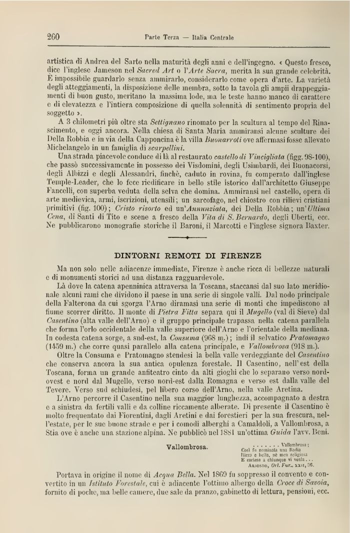 A 3 chilometri più oltre sta Settignano rinomato per la scultura al tempo del Rinascimento, e oggi ancora. Nella chiesa di Santa Maria ammiraiisi alcune sculture dei Della Robbia e in via della Capponcina è la villa Buonarroti ove affermasi fosse allevato Michelangelo in un famiglia di scarpettini.