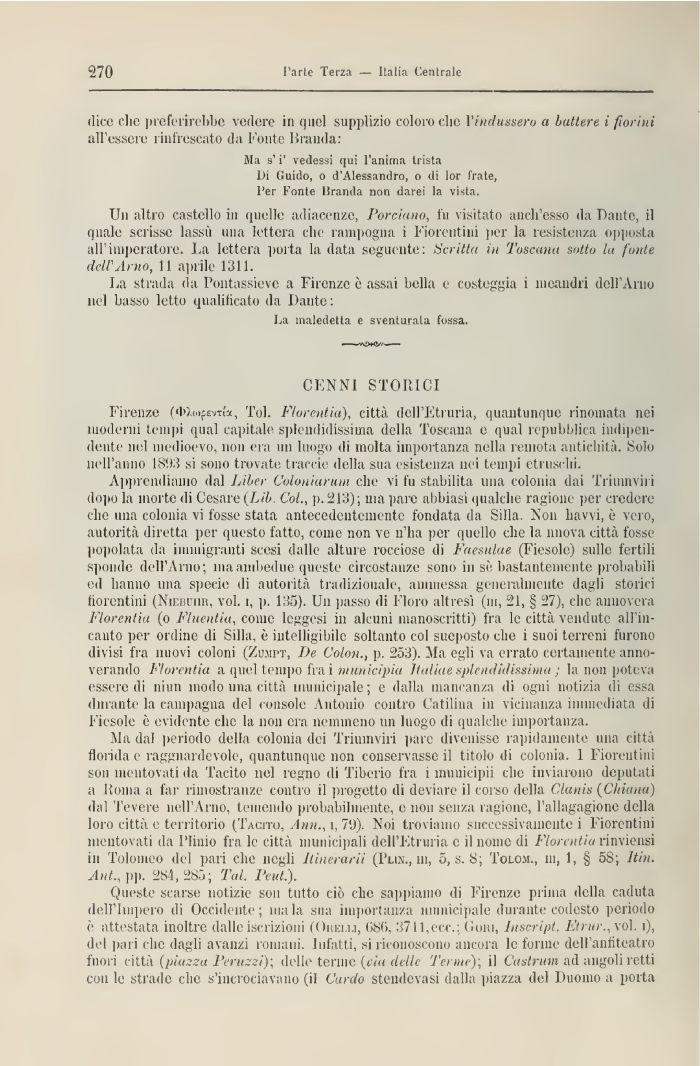 Ma dal periodo della colonia dei Triumviri pare divenisse rapidamente una città florida e ragguardevoli!, quantunque non conservasse il titolo di colonia. 1 Fiorentini son mentovati da Tacito nel regno di Tiberio fra ì nmnicipii che inviarono deputati a Roma a far rimostranze contro il progetto di deviare il corso della Clanis (C/riatta) dal Pevere nell'Arno, temendo probabilmente, e 11011 senza ragione, l'allagagione della loro città e territorio (Tacito, Ann., ì, 70). Noi troviamo successivamente ì Fiorentini mentovati da Plinio fra le città municipali delPKtiiiria e il nome di Florentia rìnviensi in Tolomeo del pari che negli Itinerarii (Plin., in, 5, s. 8; Tolom., ni, 1, § 58; Ititi. Aut., pp. 284 , 285; Tal. PeutX