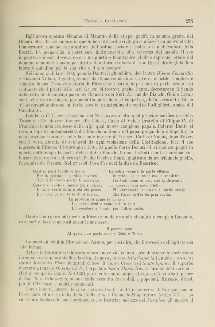 Bonifacio Vili, per istigazione dei Neri, aveva eletto qual principe pacificatore della Toscana, ch'ci doveva torcere alla Chiesa, Carlo dì Valois (fratello di Filippo IV di Francia), il (piale era sceso dalie Alpi qual nuovo campione papale. Indarno Dante si recò, a capo di un'ambasciata dei Bianchi, a Roma dal papa, pregandolo d'impedire la intromissione straniera nelle faccende interne di Firenze. Carlo di Valois, dopo d'aver, ben è vero, giurato di astenersi da ogni violazione della Costituzione, fece il suo ingresso 111 Firenze il 4 novembre 1301. Al guelfo Corso Donati ed ai suoi compagni fu aperta nottetempo la porta della città; ì Bianchi furono trattati con la massima violenza ; stato e città caddero in balìa dei Guelfi e Dante, giudicato da un tribunale guelfo, fu espulso da Firenze. Nel xvu del Paradiso ei si fa dire da Beatrice:
