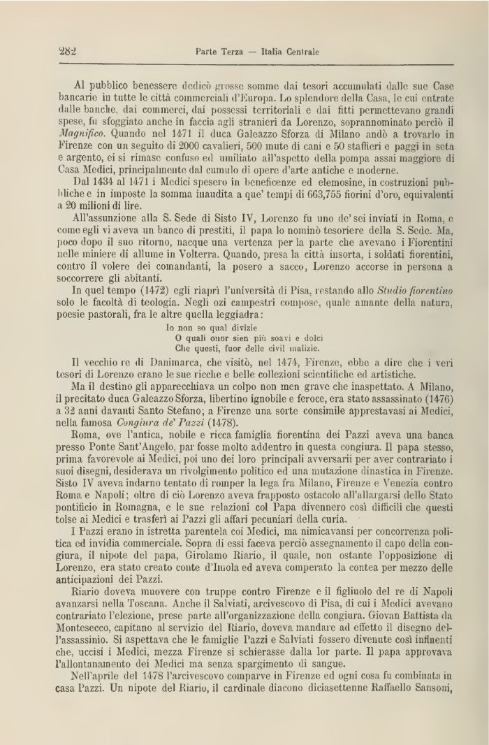 Ma il destino gli apparecchiava un colpo non men grave che inaspettato. A Milano, il precitato duca Galeazzo Sforza, libertino ignobile e feroce, era stato assassinato (1476) a 32 anni davanti Santo Stefano; a Firenze una sorte consimile apprestavasi ai Medici, nella famosa Congiura de' Pazzi (1478).