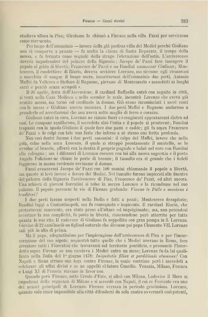 Il 2(3 aprile, festa dell' Vsceiisione, il cardinal Raffaello entrò con seguito in città, si vestì nella Casa Medicea e nello scender le scale, incontrò Lorenzo che aveva già sentito messa, ma tornò col cardinale in duomo. Già erano incominciati i sacn canti con la messa e Giuliano ancora mancava. 1 due preti Maffei e Buglione andarono a prenderlo ed accertaronsi che non aveva sotto maglia di ferro o corazza.