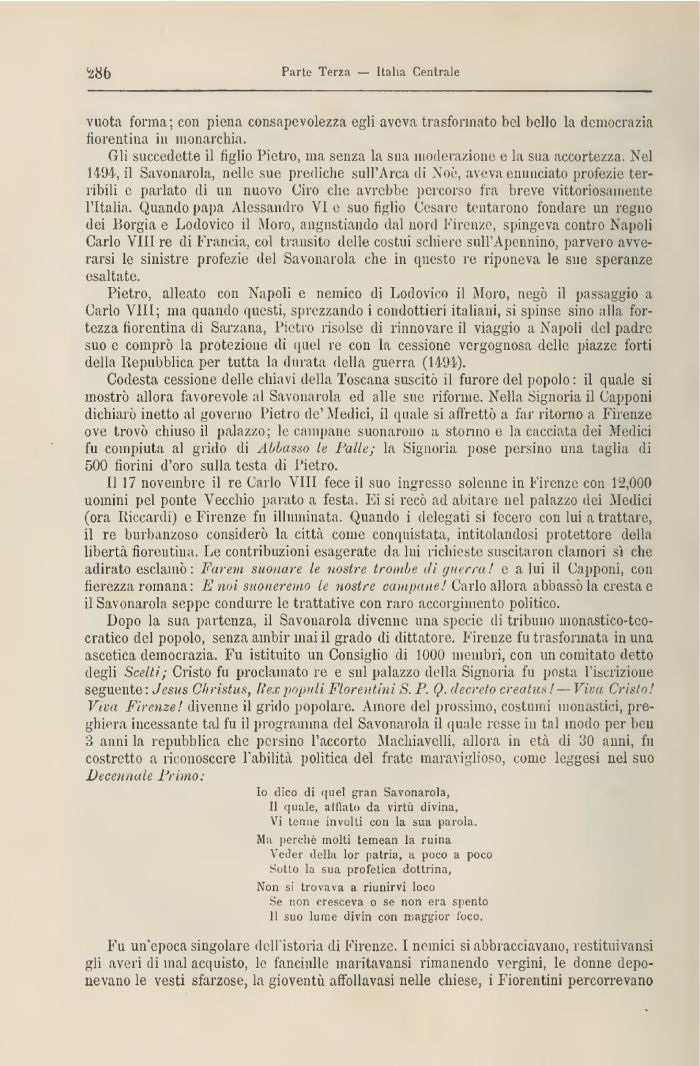 Dopo la sua partenza, il Savonarola divenne una specie di tribuno monastico-teo-cratico del popolo, senza ambir mai il grado di dittatore. Firenze fu trasformata in una ascetica democrazia. Fu istituito un Consiglio di 1000 membri, con un comitato detto degli Scelti ; Cristo fu proclamato re e sul palazzo della Signoria fu posta 1 iscrizione seguente: Jesus Christus, l'ex popitli Fiorentini S. P. Q. decreto creatimi— Viva Cristo! Viva Firenze! divenne il grido popolare. Amore del prossimo, costumi monastici, preghiera incessante tal fu il programma del Savonarola il quale resse in tal modo per ben 3 anni la repubblica che persino l'accorto Machiavelli, allora in età di 30 anni, fn costretto a riconoscere l'abilità politica del frate maraviglioso, conte leggesi nel suo Decennale lJrimo: