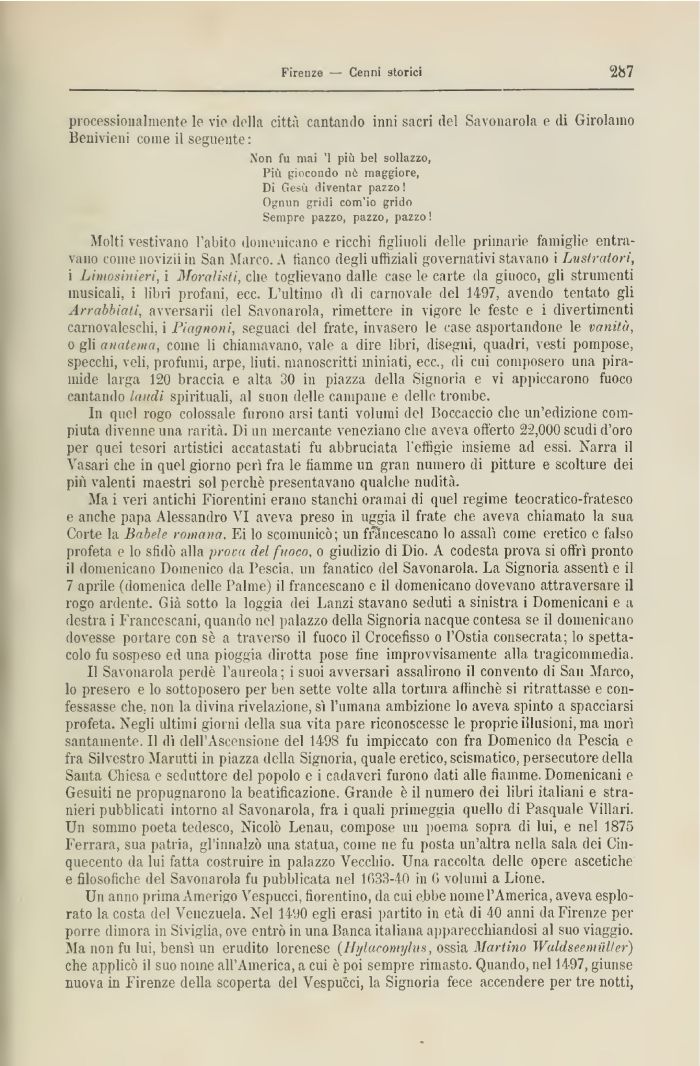 Un anno prima Amerigo Vespucc.i, fiorentino, da cui e.bbe nome l'America, aveva esplorato la costa del Venezuela. Nel 1490 egli erasi partito in età di 40 anni da Firenze per porre dimora in Siviglia, ove entrò in una Banca italiana apparecchiandosi al suo viaggio. Ma non fu lui, bensì un erudito lorenese (Ihjlaeomylus, ossia Martino WaldseeniiiUer) che applicò il suo nome all'America, a cui è poi sempre rimasto. Quando, nel 1497, giunse nuova in Firenze della scoperta del V espucci, la Signoria fece accendere per tre notti,