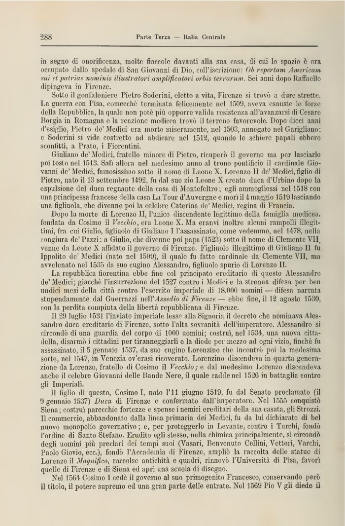 in segno di onorificenza, molte fiaccole, davanti alla sua casa, di cui lo spazio è ora occupato dallo spedale di San Giovanni di Dio, coli'iscrizione: Oh repertam Americani sui et patriac nominis illustratori amplificatori orhis ter rara m. Sei anni dopo Raffaello dipingeva in Firenze.