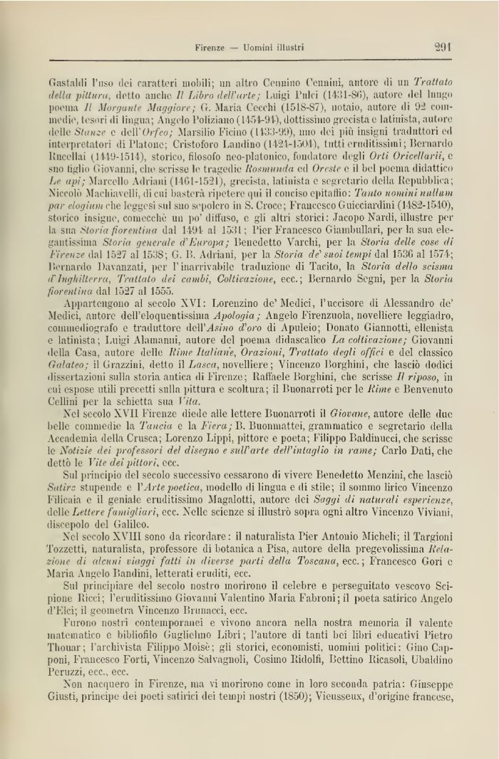 Gastaldi l'uso dei caratteri mobili; un altro Genuino Comuni, autore di un Trattato della pittura, detto anche 11 Libro dell'arte; Imigi Pulci (14SI-S6), autore del lungo poema 11 Morgmite Maggiore; G. Maria Cecclii (151S-87), notaio, autore di 92 commedie, tesori ili lingua; Angelo Poliziano ( 14;4-9-1'), dottissimo grecista e latinista, autore delle Stanze e dell'Or/co; Marsilio Piano ( 1433-99), mio dei piti insigni traduttori ed interpretatori di Platone; Cristoforo Landino (1424-1004), tutti eruditissimi; Bernardo lìncellai (1149-1514), storico, filosofo neo-platonico, fondatore degli Orli Oricellarii, e suo tiglio Giovanili, che scrisse le tragedie Rosmunda ed Oreste e il bel poema didattico Le api; Marcello Adriani (1401-1521), grecista, latinista e segretario della Repubblica; Niccolò Machiavelli, di cui basterà ripetere qui il conciso epitaffio: Tanto nomini nalhim par elogium che leggesi sul suo sepolcro in S. Croce; Francesco Guicciardini (1482-1510), Storico insigne, comecché un po' diffuso, e gli altri storici: Jacopo Nardi, illustre per la sua Storia fiorentina dal 1491- al 1531: Pier Francesco Giainbullari, per la sua elegantissima Storia generale d'Europa; Benedetto Varchi, per la Storia delle cose di Firenze dal 1527 al 1538; G. B. Adriani, per la Storia de suoi tempi dal 1530 al 1574; Bernardo Davanzali, per l'inarrivabile traduzione di Tacito, la Storia dello scisma d'Inghilterra, Trattato dei cambi, Coltivazione, ecc.; Bernardo Segni, per la Storia fiorentina dal 1527 al 1555.