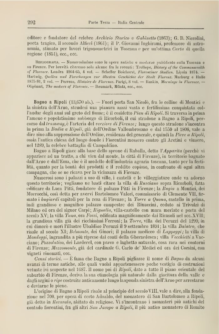 Iìibmogkakia. — Numerosissime sono le opere antiche e moderne pubbliaite sulla Toscana e su Firenze. Per brevità citeremo solo alcune fra le recenti: Trollupe, flisiorg of the Commonwealth of Florence. Londra 1804-G5, 4- voi. — Scbeffnr Boichorst, Fiorentiner Studiai. Lipsia 1874. — Uaftwig, Quelten und Forscltunyen zar attesimi Geschiehie (ter Stadi Florenz. Marburg e Halle 1875-81, 2 voi. — Perrens, ilmtoire de Florence. Parigi, 8 voi. — Iiuskin, Jllorniiujts in Florence. — Oiipliant, The mnkers of Florence. — Keumaik, Muntz, ecc., ecc.