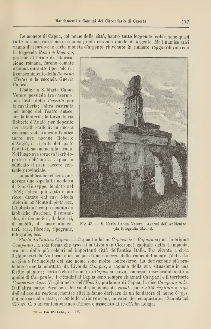 La pubblica beneficenza annovera due ospedali, uno detto di San Giuseppe, fondato nel 1858; l'altro, più vasto e più ricco, dotato dal cav. Nicola Melario., un Monte di pietà, ecc. L'industria è rappresentata da fabbriche d'arcioni, di ceramiche, di fiammiferi, di laterizi, di mobili, di paste aliiuen- Fig, 43. — S. Maria Capua Velere: Avanzi dell'Anfiteatro tari, ecc.; librerie, tipografie, (da fotografia Mauri).