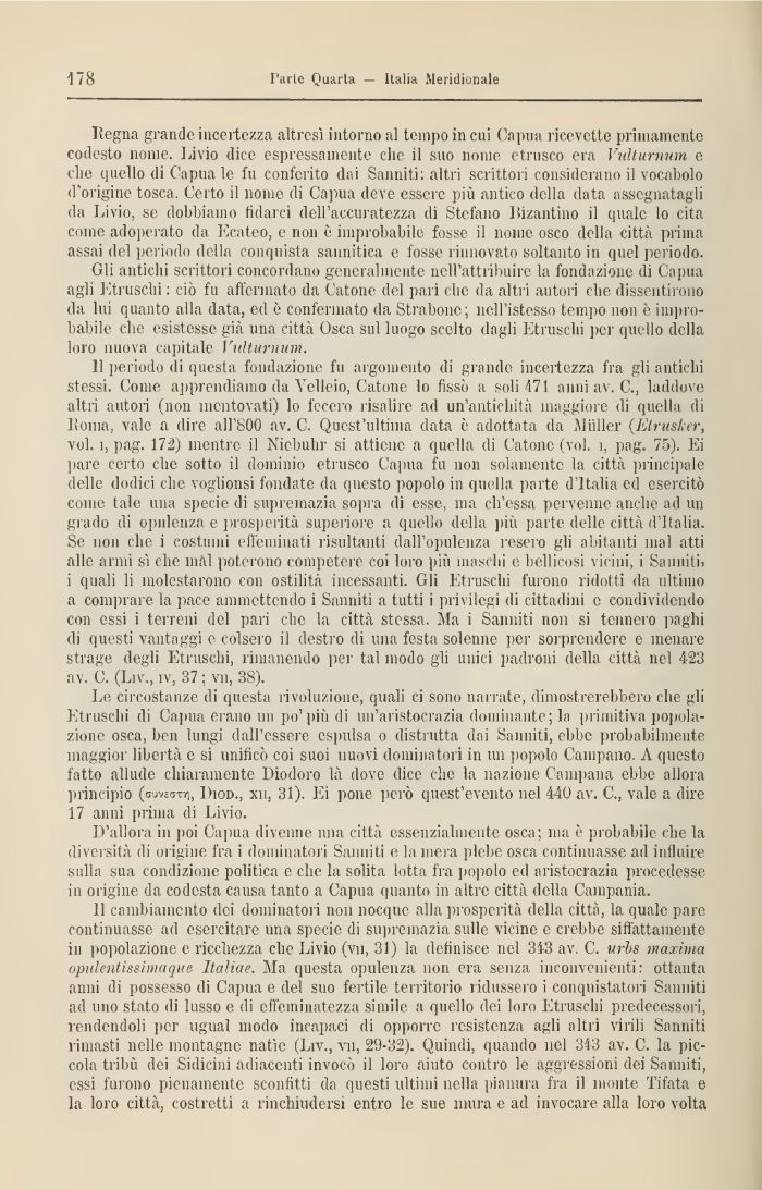 B periodo di questa fondazione fu argomento di grande incertezza fra gli antichi stessi. Come apprendiamo da Yelleio, Catone lo fissò a soli 471 anni av. C., laddove altri autori (non mentovati) lo fecero risalire ad un'antichità maggiore di quella ili Roma, vale a dire all'800 av. C. Quest'ultima data è adottata da Miller (Etrusker, voi. i, pag. 172) mentre il Nicbuhr si attiene a quella di Catone (voi. ì, pag. 75). Ei pare certo die sotto il dominio etrusco Capua fu non solamente la città principale delle dodici che voglionsi fondate da questo popolo in quella parte d'Italia ed esercitò come tale una specie di supremazia sopra di esse, ma ch'essa pervenne anche ad un grado di opulenza e prosperità superiore a quello della più parte delle città d Italia. Se non che i costami effeminati risultanti dall'opulenza resero gli abitanti mal atti alle armi sì che mal poterono competere coi loro più maschi e bellicosi vicini, i Sanniti) i quali li molestarono con ostilità incessanti. Gli Etruschi furono ridotti da ultimo a comprare la pace ammettendo i Sanniti a tutti i privilegi di cittadini e condividendo con essi i terreni del pari che la città stessa. Ma i Sanniti non si tennero paghi di questi vantaggi e colsero il destro dì una festa solenne per sorprendere e menare strage degli Etruschi, rimanendo per tal modo gli unici padroni della città nel 423 av. C. (Liv., ìv, 37 ; vii, 38).