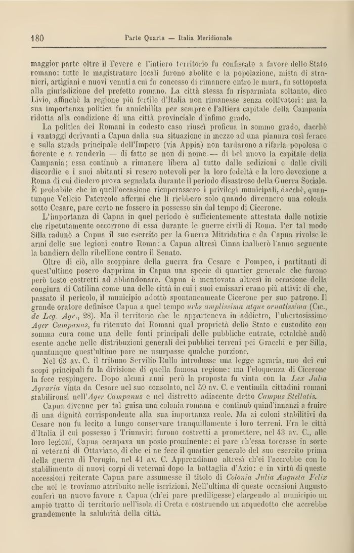 Oltre di ciò, allo scoppiare della guerra fra Cesare e Pompeo, i parti tanti di quest'ultimo posero dapprima in Capua una specie di quartier generale che furono però tosto costretti ad abbandonare. Capua è mentovata altresì in occasione della congiura di Catihna come una delle città in cui i suoi emissari erano più attivi: di che, passato il pericolo, il municipio adottò spontaneamente Cicerone per suo patrono. Il grande oratore definisce Capua a quel tempo urbs amplissima atque mnatissima (Cic., de Leg. Agr., 28). Ma il territorio che le apparteneva in addietro, 1 ubertosissimo Ager Campanus, fu ritenuto dai Romani qunl proprietà dello Stato e custodito con somma cura come una delle fonti principali delle pubbliche entrate, cotalchè andò esente anche nelle distribuzioni generali dei pubblici terreni pei Gracchi e per Siila, quantunque quest'ultimo pare ne usurpasse qualche porzione.