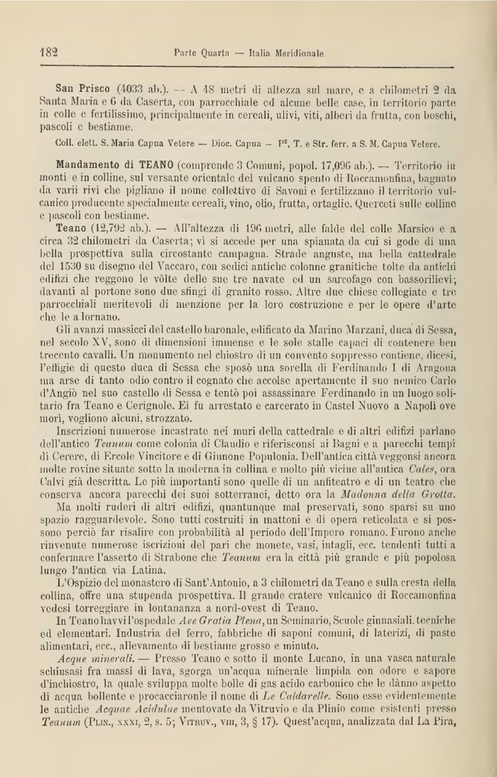 Acque minerali. — Presso Teano e sotto il monte Tucano, in una vasca naturale schiusasi fra inassi di lava, sgorga un'acqua minerale limpida con odore e sapore d'inchiostro, la quale sviluppa molte bolle di gas acido carbonico che le dànno aspetto di acqua bollente e procacciaronle il nome di Le Caldarelle. Sono esse evidentemente le antiche Acquae Acidulae mentovate da Vitruvio e da Plinio come esistenti presso Teauum (Plin., xxxi, 2, s. 5; Vrnmv., vm, 3, § 17). Quest'acqua, analizzata dal La Pira,