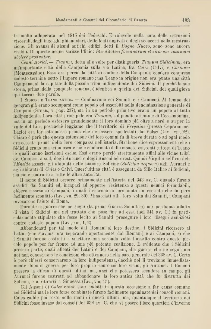 Cenili storici. — Teanum, detta alle volte per distinguerla Teanurn Sidicinuni, era Un'importante città della Campania sulla via Latina, fra Cales (Calvi) e Casinum (Montecassino). Essa era perciò la città di contine della Campania com'era compreso codesto termine sotto l'Impero romano ; ma Teano in origine non era punto una città Campana, sì la capitale della piccola tribù indipendente dei Sidiciui. Il perchè la sua storia, prima della conquista romana, è identica a quella dei Sidicini, dei quali giova qui toccar due parole.