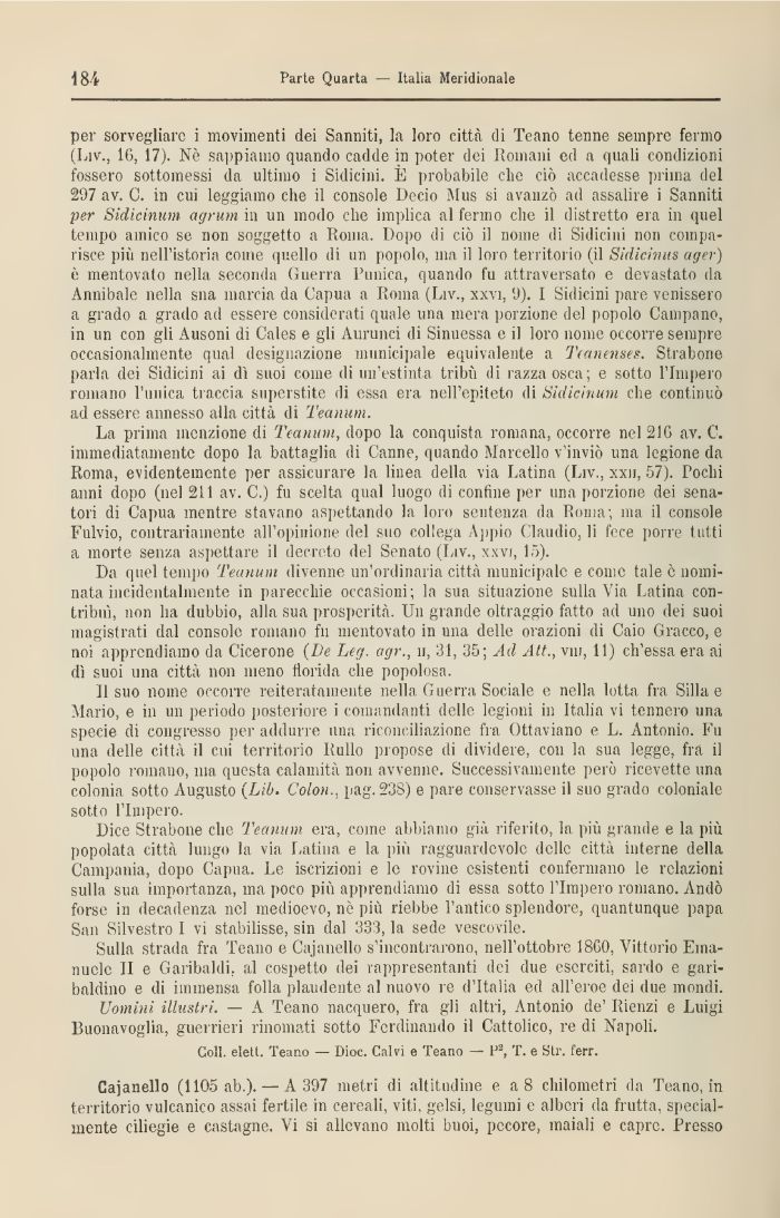 per sorvegliare i movimenti dei Sanniti, la loro città di Teano tenne sempre fermo (Liv., 16, 17). Nè sappiamo quando cadde in poter dei Romani ed a quali condizioni fossero sottomessi da ultimo i Sidicini. È probabile che ciò accadesse prima del 297 av. 0. in cui leggiamo che il console Decio Mus si avanzò ad assalire i Sanniti per Sidicinum ctgrum in un modo che implica al fermo che il distretto era in quel tempo amico se non soggetto a Roma. Dopo di ciò il nome di Sidicini non comparisce più nell'istoria come quello di un popolo, ma il loro territorio (il Sidicìnus ager) è mentovato nella seconda Guerra Punica, quando fu attraversato e devastato da Annibale nella sua marcia da Capua a Roma (Liv., xxvi, 9). I Sidicini pare venissero a grado a grado ad essere considerati quale una mera porzione del popolo Campano, in un con gli Ausoni di Cales e gli Aurunci di Sinuessa e il loro nome occorre sempre occasionalmente qual designazione municipale equivalente a Teanenses. Strabone parla dei Sidicini ai dì suoi come di un'estinta tribù di razza osca; e sotto l'Impero romano l'unica traccia superstite di essa era nell'epiteto di Sidicinum che continuò ad essere annesso alla città di Teanum.