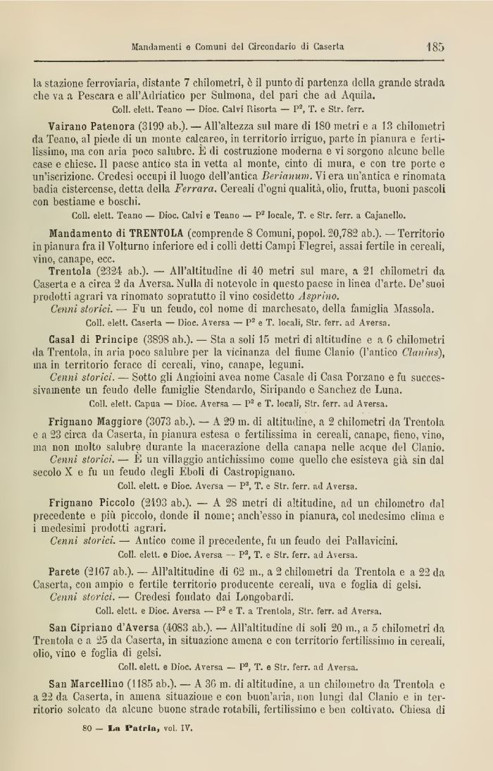 Parete (2107 ab.). All'altitudine di G2 in., a 2 chilometri da Trentola e a 22 da Caserta, con ampio e fertile territorio producente cereali, uva e foglia di gelsi.