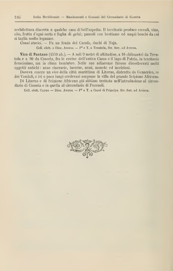Vico di Pantano (1559 ab.). — A soli 9 metri di altitudine, a 10 chilometri da Trentola e a 30 da Caserta, fra le rovine dell'antica Cuma e il lago di Patria, in territorio feracissimo, ma in clima insalubre. Nelle sue adiacenze furono dissotterrati molti oggetti antichi : urne cinerarie, lucerne, armi, monete ed iscrizioni.