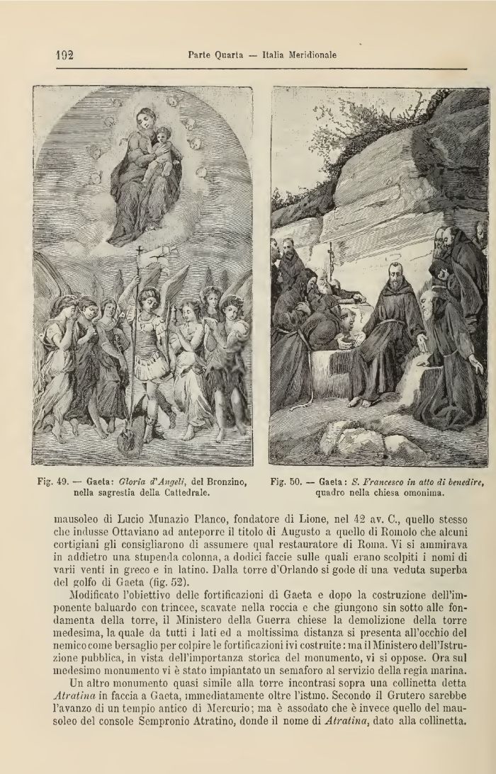 mausoleo di Lucio Munazio Fianco, fondatore di Lione, nel 42 av. C., quello stesso clic indusse Ottaviano ad anteporre il titolo di Augusto a quello di Romolo clic alcuni cortigiani gli consigliarono di assumere qual restauratore di Roma. Vi si ammirava in addietro una stupenda colonna, a dodici faceti sulle quali erano scolpiti i nomi di varii venti in greco e in latino. Dalla torre d'Orlando si gode di una veduta superba del golfo di Gaeta (fig. 52).