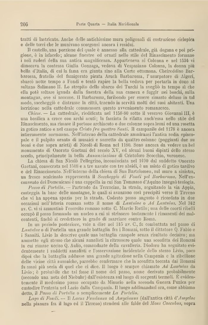 Passo di Portello, — Partendo da Terracina, la strada, seguitando la via Appia, costeggia la base delle montagne, le quali si avanzano così precipiti verso il Tirreno che vi ha appena spazio per la strada. Codesto passo angusto è ricordato in due occasioni nell'istoria romana sotto il nome di Lantulae o Ad Lantulas. Nel 342 av. C. vi si ammutinò l'esercito romano sotto C. Marcio Rutilo; una delle coorti ribelli occupò il passo formando un nucleo a cui si strinsero tostamente i rimanenti dei malcontenti, finché si credettero in grado di marciare contro Roma.
