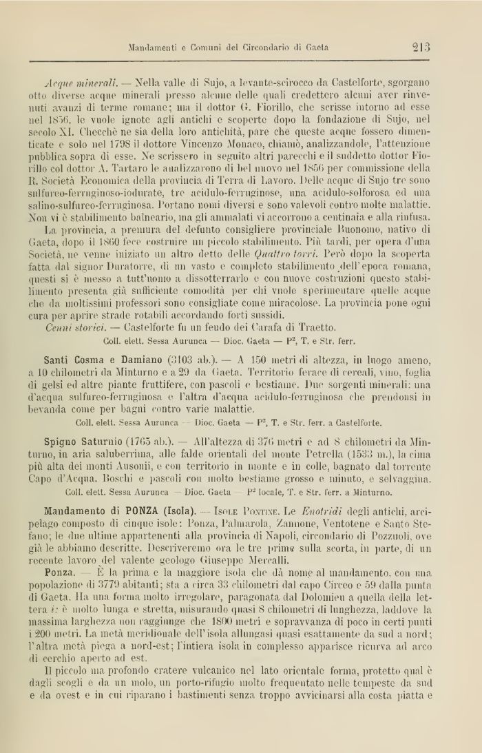 Mandamento di PONZA (Isola). Isole Pontine. Le Enotridi degli antichi, arcipelago composto di cinque isole: Ponza, Palmarola, Zannone, Ventotene e Santo Stefano; le due ultime appartenenti alla provincia di Napoli, circondario di Pozzuoli, ove già le abbiamo descritte. Descriveremo ora le tre prini» sulla scorta, in parte, di un recente lavoro del valente geologo Giuseppe Mercalli.