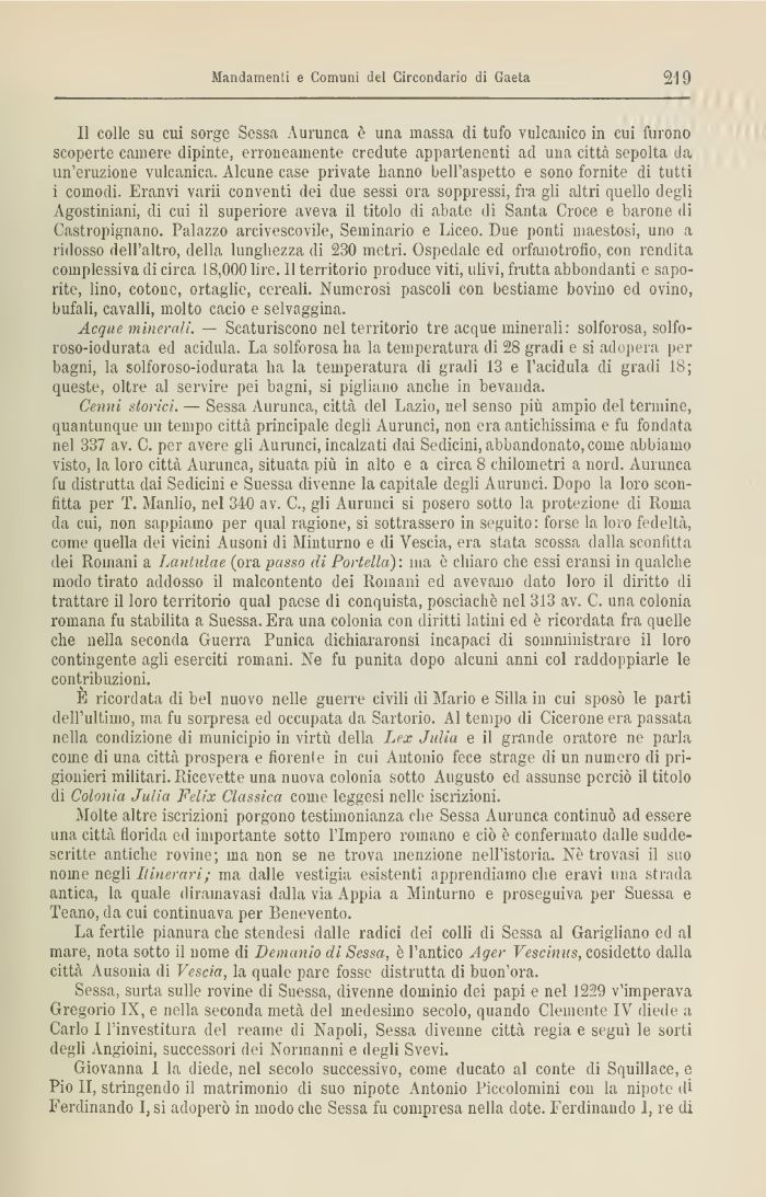 La fertile pianura che stendisi dalle radici dei colli di Sessa al Garigliano ed al mare, nota sotto il nome di Demanio di Sessa, ò l'antico Ager Vescinits, cosidetto dalla città Ausonia di Vescia, la quale pare fosse distrutta di buon'ora.