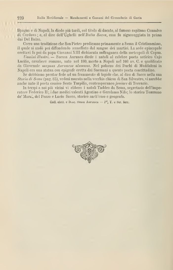 Domini illustri. — Suessa Aurunca diede i natali al celebre poeta satirico Cajo Lucilio, cavaliere romano, nato nel 180, morto a Napoli nel 103 av. C. e qualificato da Giovenale magnits Auruncae alumnus. Nel palazzo dei Duchi di Maddaloni in Napoli era una statua con epigrafe eretta dai Suessani a questo poeta concittadino.
