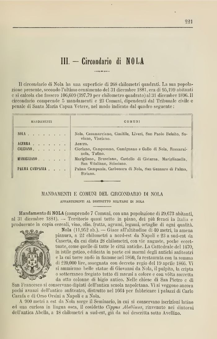 Mandamento di NOLA (comprendo 7 Comuni, con una popolazione di 29,673 abitanti, al 31 dicembre 1881). — Territorio quasi tutto in piano, dei più feraci in Italia e producente in copia cereali, vino, olio, frutta, agrumi, legumi, ortaglie di ogni qualità.