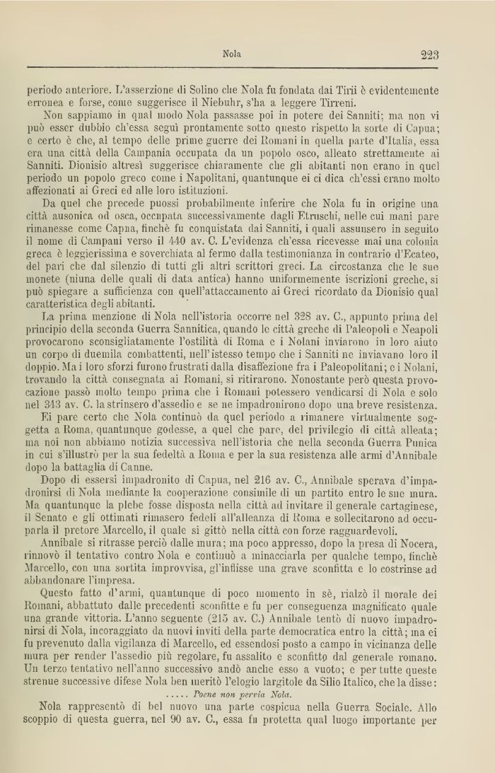 Non sappiamo in qual modo Nola passasse poi in potere dei Sanniti; ma non vi può esser dubbio ch'essa seguì prontamente sotto questo rispetto la sorte di Capua; e certo è che, al tempo delle prime guerre dei Romani in quella parte d'Italia, essa era una città della Campania occupata da un popolo osco, alleato strettamente ai Sanniti. Dionisio altresì suggerisce chiaramente che gli abitanti non erano in quel periodo un popolo greco come i Napolitani, quantunque ei ci dica ch'essi erano molto affezionati ai Greci ed alle loro istituzioni.