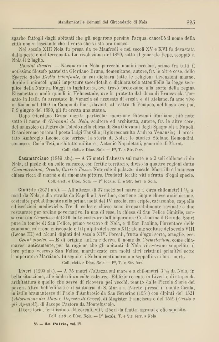 Uomini illustri. — Nacquero in Nola parecchi uomini preclari, primo fra tutti il notissimo filosofo panteista Giordano Bruno, domenicano, autore, fra le altre cose, dello Spaccio della Bestia trionfante, in cui dichiara tutte le religioni invenzioni umane, deride i miracoli quali imposture sacerdotali e dichiara solo attendibile la legge semplice della Natura. Fuggì in Inghilterra, ove trovò protezione alla corte della regina Elisabetta e andò quindi in Helrnestade, ove fu protetto dal duca di Brunswick. Tornato in Italia fu arrestato in Venezia ed accusato di eresia e di ateismo, fu arso vivo in Roma nel 1600 in Campo di Fiori, davanti al teatro di Pompeo, nel luogo ove poi, il 9 giugno del 1889, gli fu eretta una statua.