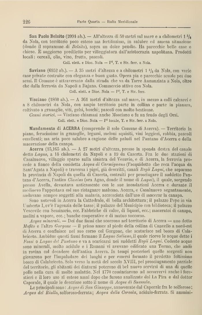 Acque minerali. — Dei due fiumi che scorrono nel territorio di Acerra — uno detto Moftto e l'altro Gorgone — il primo nasce al piede della collina di Cancello a nord-est di Acerra e confluisce nel suo corso col Gorgone, che scaturisce nel bosco di C'ala-briceto. Ambitine questi fiumi formano il Lagno Saliano, il quale riceve le acque dette i Fossi o Lagno del l'untano e va a scaricarsi nei suddetti Hegiì Lagni. Codeste acque sono minerali, molto acidule e i Romani vi avevano edificato una 'ferma, che andò in rovina col decadere dell'antica Acerra. In tempi posteriori quelle sorgenti non giovarono per l'impaludare dei luoghi e per essersi formato il predetto foltissimo bosco di Calabriceto. Solo verso la metà del secolo XVHl, pel prosciugamento parziale del territorio, gli abitanti dei dintorni poterono di bel nuovo servirsi di una di quelle polle nella cura di molte malattie. Nel 1770 cominciarono ad accorrervi anche i forestieri e il loro uso si estese assai dopo che furono analizzate dal La Pira e dal dottor Caporale, il quale le descrisse sotto il nome di Acque di Suessola.