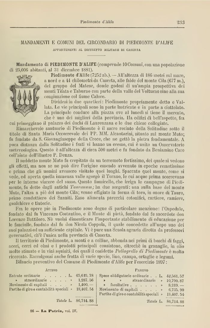 Bilancio preventivo del Comune di Piedimonte d'Alife per l'esercìzio 1897: