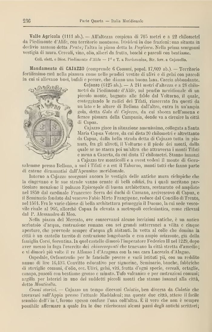 Cajazzo (6125 ab.). — A 211 metri d'altezza e a 21 chilometri da Piedi in oh te d'Alifo, sul pendìo meridionale di un piccolo monte, bagnato alle falde dal Volturno, il quale, costeggiando le radici dei Tifati, rinserrato fra questi da uu lato e le alture di Bellona dall'altro, entra iu un'ampia gola, detta Gola di Cajazzo, da cui sbocca nell'amena e ferace pianura della Campania, donde va a circuire la città di Capua.