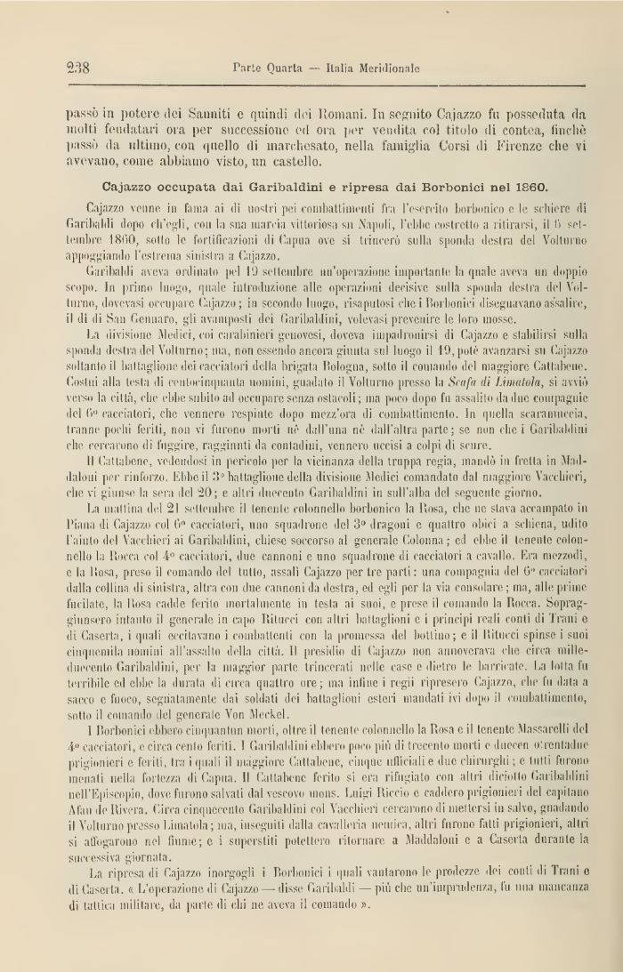 La mattina del 21 sctlenibre il tenente ('(donneilo borbonico la Uosa, che ne stava accampato in Piana di Cajazzo Col 0 cacciatori, min squadrone del 3° dragoni e quattro obici a schiena, udito l'aiuto lei Yacchiei'i ai Garibaldini, chiese soccorso al generale Colonna ; ed ebbe il tenente colon nello la Rocca col 4° cacciatori, due cannoni e uno squadrone di cacciatori a cavallo. Fra mezzodì, e la Iiosa, preso il comando del tulta, assalì Cajazzo per tre parti: una compagnia del (3 cacciatori dalla collina di sinistra, altra con due cannoni ila destra, ed egli per la via consolare ; ma, alle prime fucilate, la Uosa cadde ferito mortalmente in testa ai suoi, e prese il cornando la lincea. Soprag-giunsero intanto il generale in capo Rilucei con altri battaglioni c i prìncipi reali colili di Trèni e di Caserta, i quali eccitavano i combattenti con la promessa del bottino; e il liitucci spinse i suoi cinquemila nomini all'assalto della citlà. Il presidio di Cajazzo non annoverava che circa milleduecento Garibaldini, per la maggior parte trincerati nelle case e dietro le barricate. La lotta fu terribile ed ebbe la durata di cicca quattro ore; ina inline i regìi ripresero Caja/zo, che fu data a sacco e fuoco, segnatamente dai soldati dei battaglioni esteri mandati ni dopo il combattimento, sotto il comando del generale Vnn Meckel.