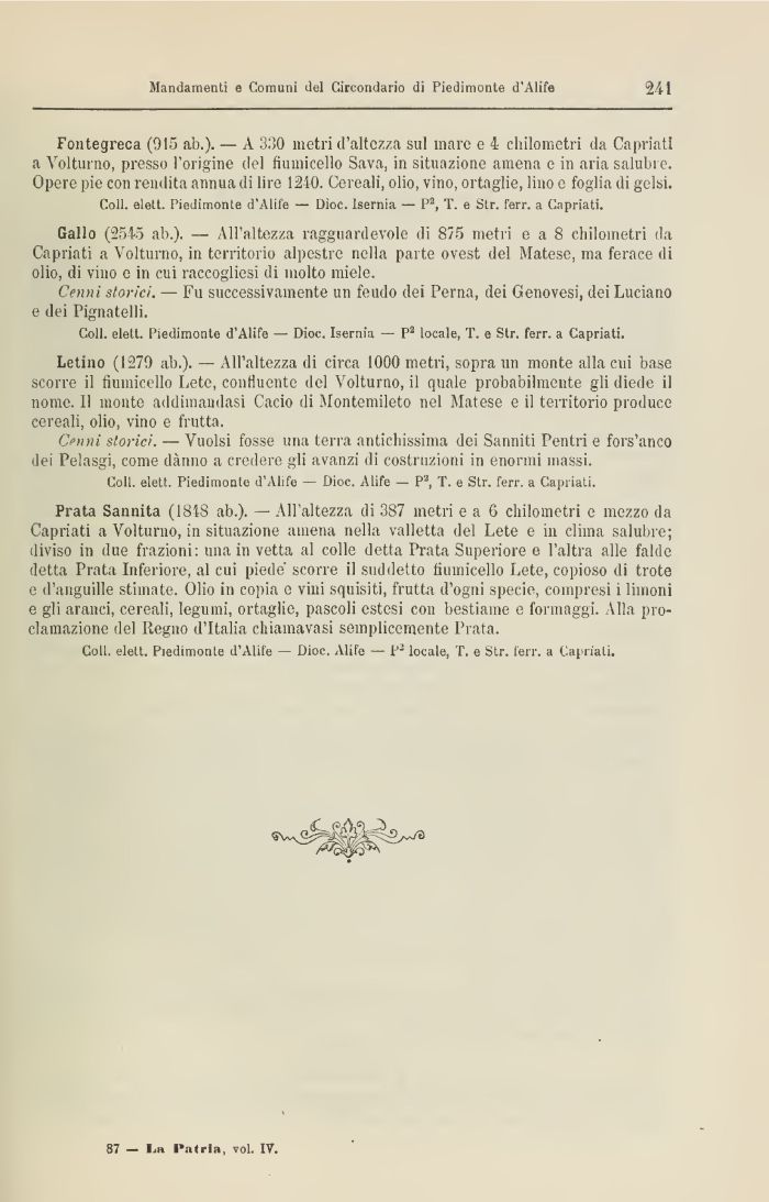 Gallo (2545 ab.). All'altezza ragguardevole di 875 metri e a 8 chilometri da Capriati a Volturno, in territorio alpestre nella parte ovest del Ma tese, ma ferace di olio, di vino e in cui raccogliesi di molto miele.