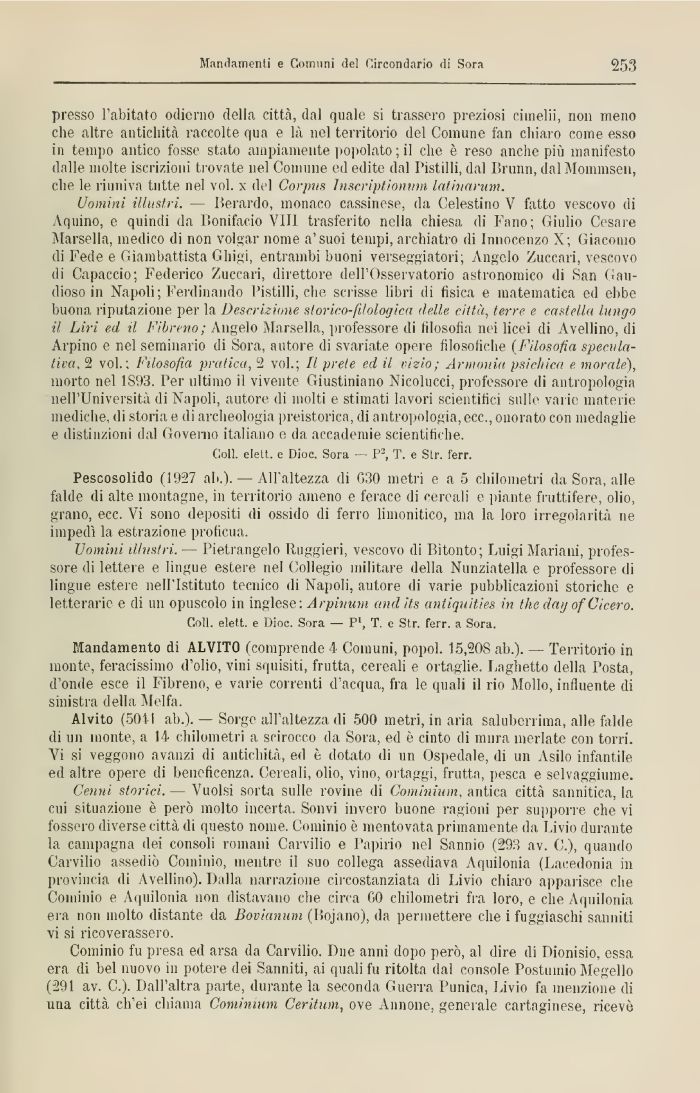 Uomini illustri. — Berardo, monaco cassinese, da Celestino V fatto vescovo di Aquino, e quindi da Bonifacio VII! trasferito nella chiesa di Fano; Giulio Cesare Marsella, medico di non volgar nome a'suoi tempi, archiatra di Innocenzo X; Giacomo di Fede e Giambattista Ghigi, entrambi buoni verseggiatori; Angelo Zuccari, vescovo di Capaccio; Federico Zuccari, direttore dell'Osservatorio astronomico di San Gaudioso in Napoli; Ferdinando l'istilli, che scrisse libri di fìsica e matematica ed ebbe buona riputazione per la Descrizione storico-filologica delle città, terre e castella lungo il Livi ed il Fibreno; Angelo Marsella, professore di filosofia nei licei di Avellino, di Arpino e nel seminario di Sora, autore di svariate opere filosofiche (Filosofia speculativa. 2 voi.. Filosofia pratica, 2 voi.; Il prete ed il vizio; Armonia psichica e morale), morto nel 1S93. Per ultimo il vivente Giustiniano Nicolucci, professore di antropologia nell'Università di Napoli, autore di molti e stimati lavori scientifici sulle varie materie mediche, di storia e di archeologia preistorica, di antropologia, ecc., onorato con medaglie e distinzioni dal Governo italiano e da accademie scientifiche.
