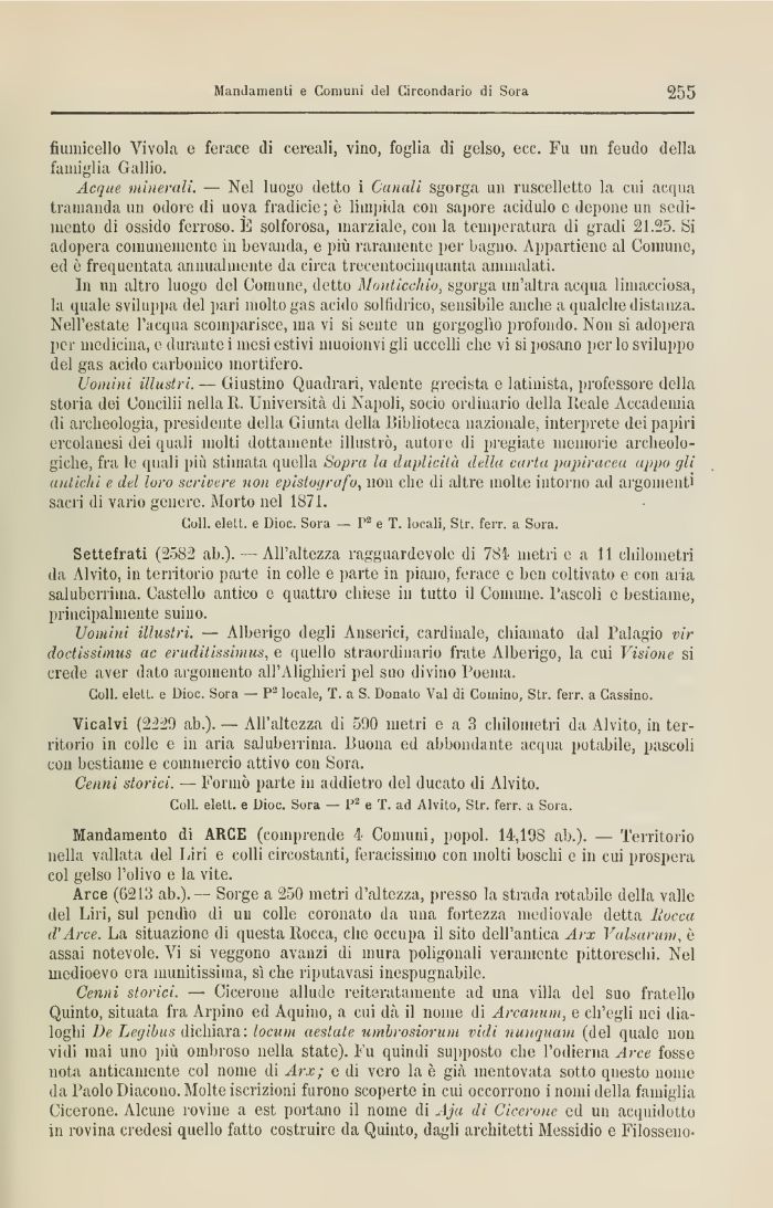 Cenni storici. — Cicerone allude reiteratamente ad una villa del suo fratello Quinto, situata fra Alpino ed Aquino, a cui dà il nome di Arcauìim, e ch'egli nei dialoghi De Legihtts dichiara : locum nestaie umlrosiorum vidi nunquam (del (piale 11011 vidi inai uno più ombroso nella state). Fu quindi supposto che l'odierna Arce fosse nota anticamente col nome di Arx; e di vero la è già mentovata sotto questo nome da Paolo Diacono. Molte iscrizioni furono scoperte in cui occorrono i nomi della famiglia Cicerone. Alcune rovine a est portano il nome di Aja di Cicerone ed un acqnidutto in rovina credesi quello fatto costruire da Quinto, dagli architetti Messidio e Filosseno-