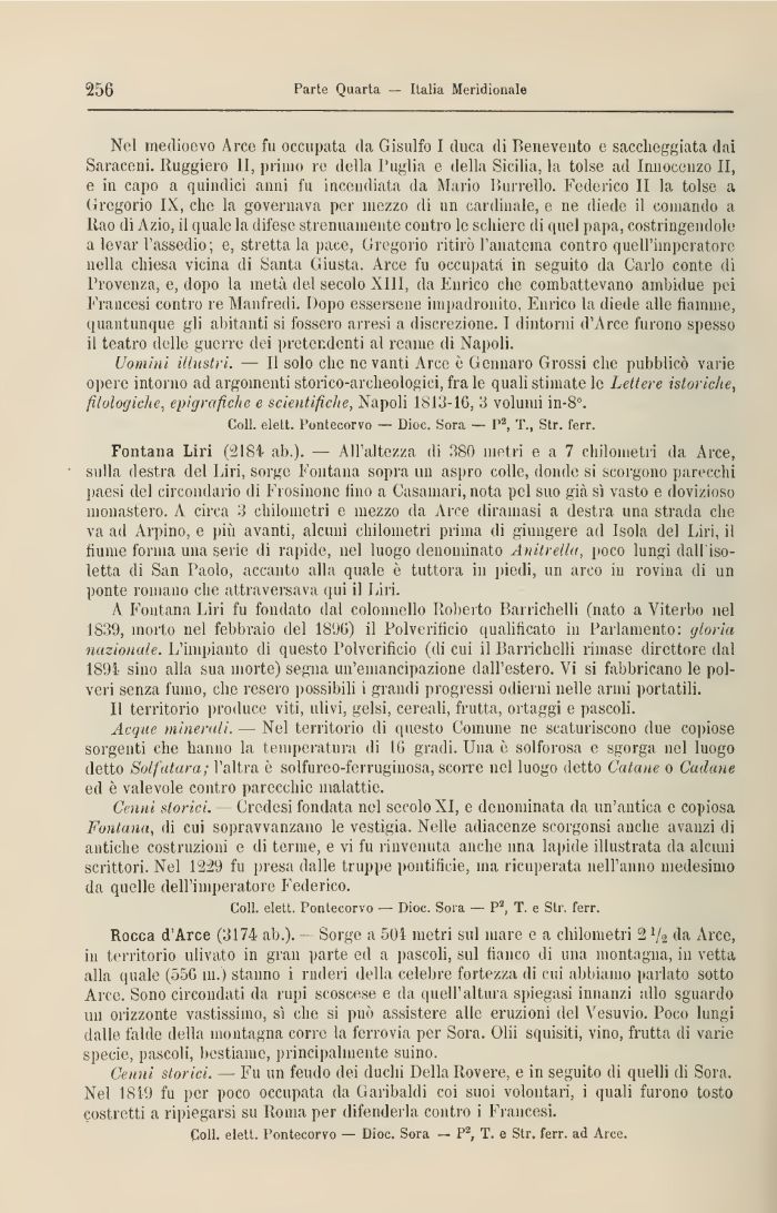 Fontana Liri (3181 ab.). — All'altezza di 380 metri e a 7 chilometri da Arce, sulla destra del Liri, sorge Fontana sopra un aspro colle, donde si scorgono parecchi paesi del circondario di Prosinone fino a Casamari, nota pel suo già sì vasto e dovizioso monastero. A circa 3 chilometri e mezzo da Arce diramasi a destra una strada che va ad Arpino, e più avanti, alcuni chilometri prima di giungere ad Isola del Liri, il fiume forma una serie di rapide, nel luogo denominato Anitrella, poco lungi clall iso-letta di San Paolo, accanto alla quale è tuttora in piedi, un arco in rovina di un ponte romano che attraversava qui il Liri.