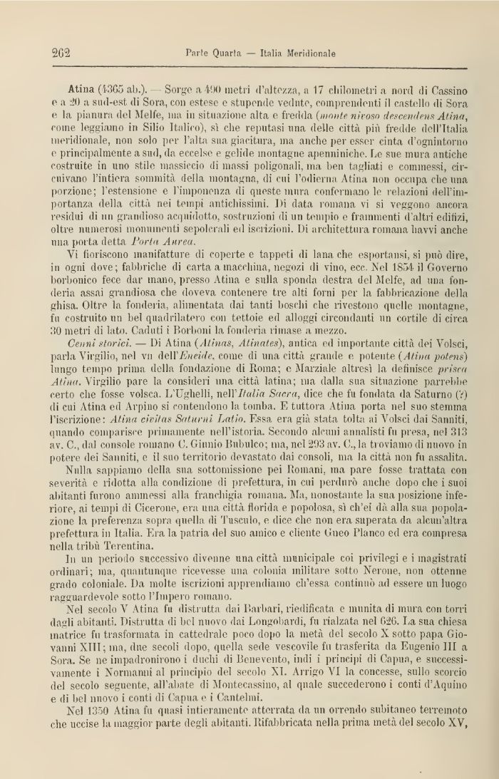 Cernii storici. — Di Atina (Atinas, Atinut.es), antica ed importante città dei Yolsci, parla Virgilio, nel vii (\<ì\Yl'incide, come di una città grande e potente (Atina pofens) lungo tempo prima della fondazione di Roma; e Marziale altresì la definisce prisca Atina. Virgilio pare la consideri una città latina; ma dalla sua situazione parrebbe certo che fosse volsca. L'Ughelli, noli' Italia Sacra, dice che fu fondata da Saturno (V) di cui Atina ed Arpino si contendono la tomba. E tuttora Atina porta nel suo stemma l'iscrizione: Atina civitas Saturni Latin. Essa era già stata tolta ai Volsci dai Sanniti, quando comparisce primamente nell'istoria. Secondo alcuni annalisti fu presa, nel 313 av. C., dal console romano C. Giiuiio Bubulco; ma, nel 293 av. C., la troviamo di nuovo in potere dei Sanniti, e il suo territorio devastato dai consoli, ma la città non fu assalita.