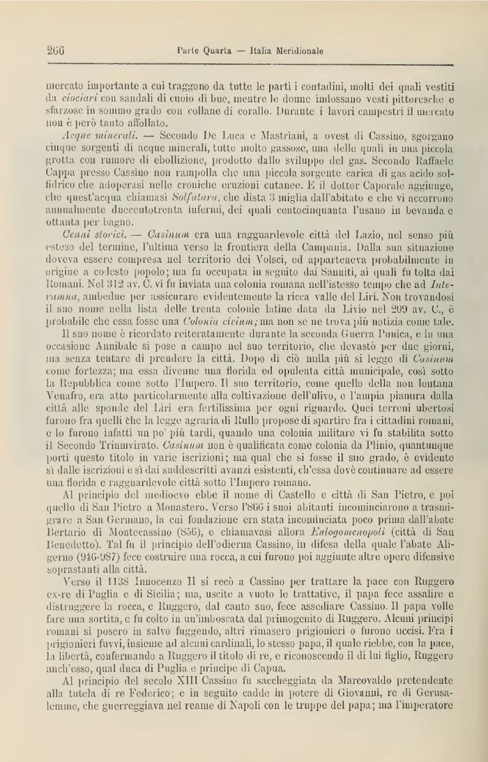 Acque minerali. — Secondo J)e Luca e Mastriaiii, a ovest di Gassino, sgorgano cinque sorgenti di acque minerali, tutte molto gassose, una delle quali in una piccola grotta con rumore di ebollizione, prodotto dallo sviluppo del gas. Secondo Raffele Cappa presso Cassino non rampolla che una piccola sorgente carica di gas acido solfidrico che adoperasi nelle croniche eruzioni cutanee. E il dottor Caporale aggiunge, che quest'acqua chiamasi Solfatara, che dista 3 miglia dall'abitato e che vi accorrono annualmente duecentotrenta infermi, dei quali centocinquanta l'usano in bevanda e ottanta per bagno.