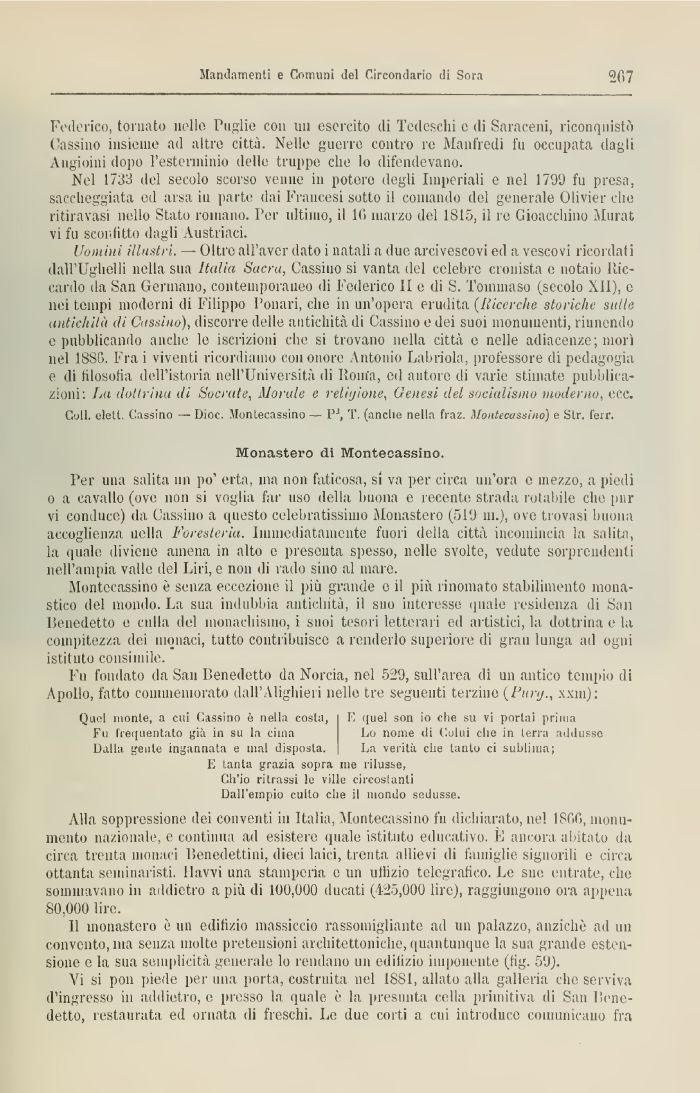 Quel monte, a cui Cassino è nella costa, K quel son io che su vi portai prima Fu frequentato già in su la cima Lo nome «li Colui che in (erra addusse