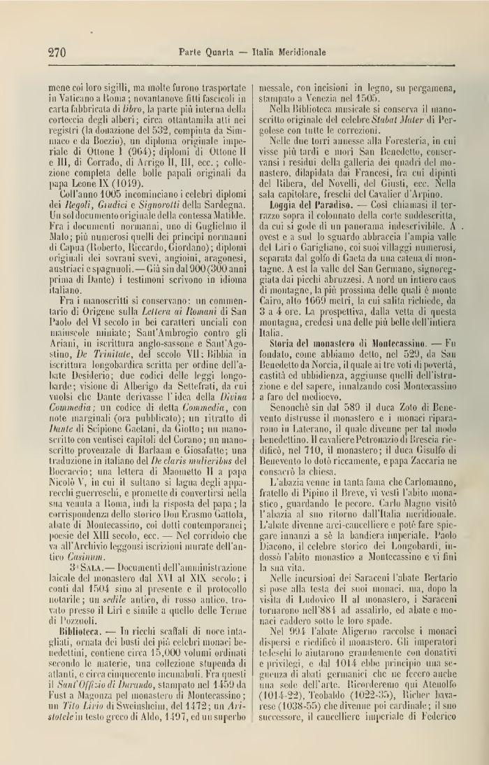 l.o(,(,ia del Paradiso. -- Cosi chiamasi il terrazzo sopra il colonnato della corte suddescritta, da cui si gode ili un panorama uidescrivibde. A ovest e a sud lo sguardo abbraccia l'ampia valle del Liri o Carigliano, coi suoi villaggi numerosi,-separala dal golfo di Gaeta da una catena.di montagne. A est la valle del San Germano, signoreggiata dai picchi abruzzesi. A nord un intiero caos di montagne, la più prossima delle quali è monte Cairo, alto 1069 metri, la cui salila richiede, (la 3 a 4 ore. La prospettiva, dalla vetta di questa mot:taglia, credesi una delle più belle dell'intiera Italia.