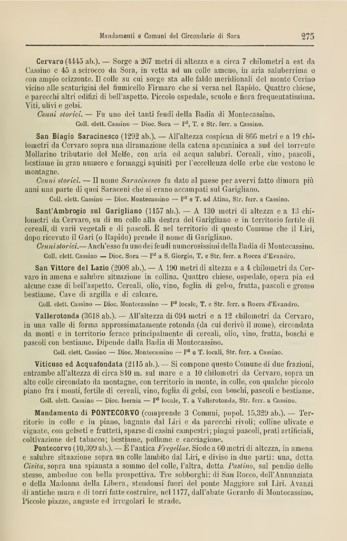 Viticuso ed Acquafondata (2115 ab.). — Si compone questo Comune di due frazioni, entrambe all'altezza di circa 810 in. sul mare e a 10 chilometri da Cervaro, sopra un alto colle circondato da montagne, con territorio in monte, in colle, con qualche piccolo piano fra i monti, fertile di cereali, vino, foglia di gelsi, con boschi, pascoli e bestiame.