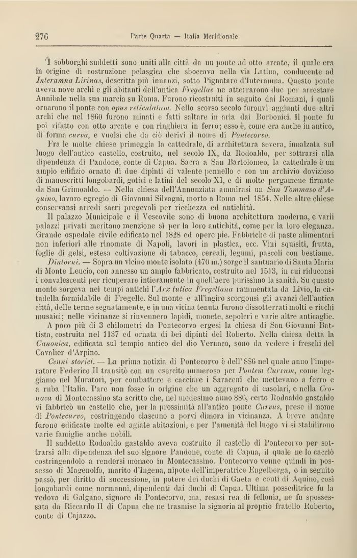 I sobborghi suddetti sono uniti alla città da uri ponte ad otto arcate, il quale era in origine di costruzione pelasgica che sboccava nella via Latina, conducente ad lnteramna Lirinas, descritta più innanzi, sotto Pigliatale d'Interainna. Questo ponte aveva nove archi e gli abitanti dell'antica Fregellae ne atterrarono due per arrestare Annibale nella sua marcia su Roma. Furono ricostruiti 111 seguito dai Romani, i quali amarono il ponte con opus reticulatum. Nello scorso secolo furonvi aggiunti due altri archi che nel 18(50 furono minati e fatti saltare ili aria dai Borbonici. Il ponte fu poi rifatto con otto arcate e con ringhiera in ferro; esso è, come era anche in antico, di forma curva, e vuoisi che da ciò derivi il nome di Pontecorvo.