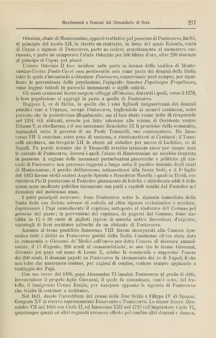 Oderisio, abate dì Montecassino, appiccò trattative pel possesso di Pontecorvo,finche, al principio del secolo XII, fu stretto un contratto, 111 forza del quale Roberto, conte di Capua e signore di Pontecorvo, parte ne cedeva gratuitamente al monastero cassinense, e parte ne comperava l'abate Oderisio per 50U libbre d'oro, oltre 290 sborsate al principe di Capua pel placet.