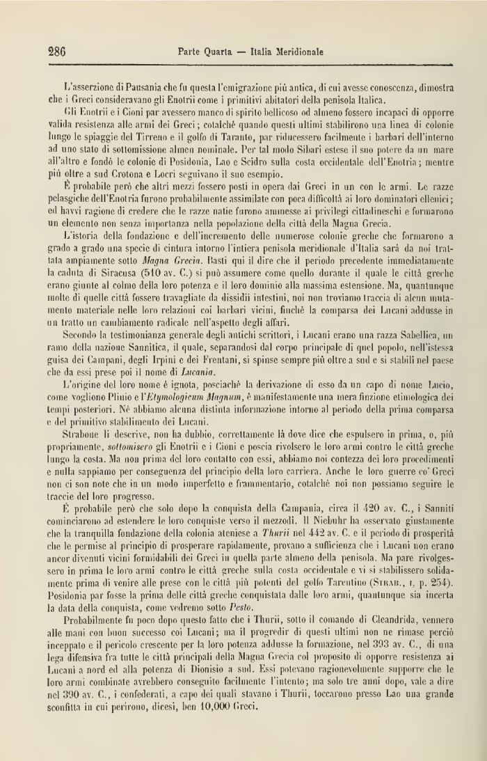 È probabile però che solo dopo la conquista della Campania, circa il #20 av. C., ì Sanniti cominciarono ad estendere le loro conquiste verso il mezzodì. Il Niebnhr ha osservato giustamente clic la tranquilla fondazione della colonia ateniese a Thurii nel 442 av. C. e il periodo di prosperità che le permise al principio di prosperare rapidamente, provano a sutlicienza che i Lucani non erano ancor divenuti vicini formidabili dei Greci in quella parie almeno della penisola. Ma pare rivolgessero in prima le loro armi contro le città greche sulla costa occidentale e vi si stabilissero solidamente prima di venire alle prese con le città più indenti del golfo Tamilico (Sih.mì., i, p. 254). Posidonia par fosse, la prima delle città greche conquistata dalle loro anni, quantunque sia incerta la data della conquista, come vedremo sotto Pesto.