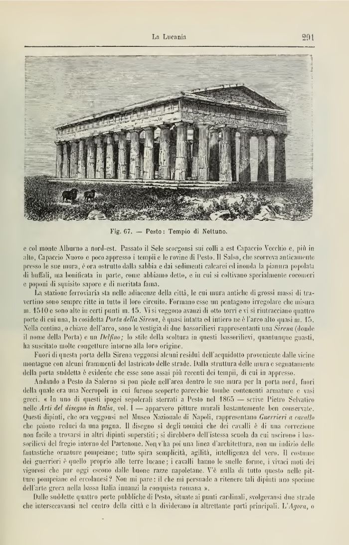 e col moiilc Alburno a nord-est. Passato il Selc scorgonsi sui colli a est Capaccio Vecchio e, più in ilio, Capaccio Nuovo c poco appresso i tempii c le rovine di Pesto. Il Salso, elio scorreva anticamente presso le sue mura, è ora ostrutto dalla sabbia e dai sedimenti calcarei ed inonda la pianura popolala di buffali, ma bonificata in parte, come abbiamo detto, e in cui si coltivano specialmente cocomeri e poponi di squisito sapore e di meritata fama.