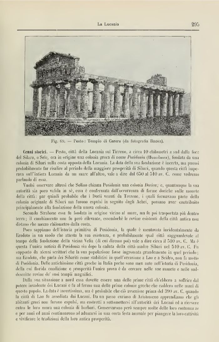 Poco sappiamo dell'istoria primitiva di I'osidonia, la (piale è mentovata incidentalmente da Erodoto m nn modo che attesta la sua esistenza, e probabilmente ipial città ragguardevole al tempo della fondazione della vicina Velia (dì cui diremo poi) vale a dire circa il 510 av. G. Ma è questa l'unica notizia di I'osidonia sin dopo la caduta della città-madre Sibari nel 510 av. C. Fi supposto da alcuni sciittnri che la sua popolazione fosse ingrossata grandemente in quel periodo; ma Erodoto, che parla dei Sibariti come stabilitisi in quell'occasione a Lao e a Scidro, non fa motto di I'osidonia. Delle antichissime città greche in Italia poche sono men note nel! istoria ili I'osidonia, della cui florida condizione e prosperità l'unica prova è da cercare nelle sue monete e nelle sud descritte rovine de' suoi tempii magnifici.