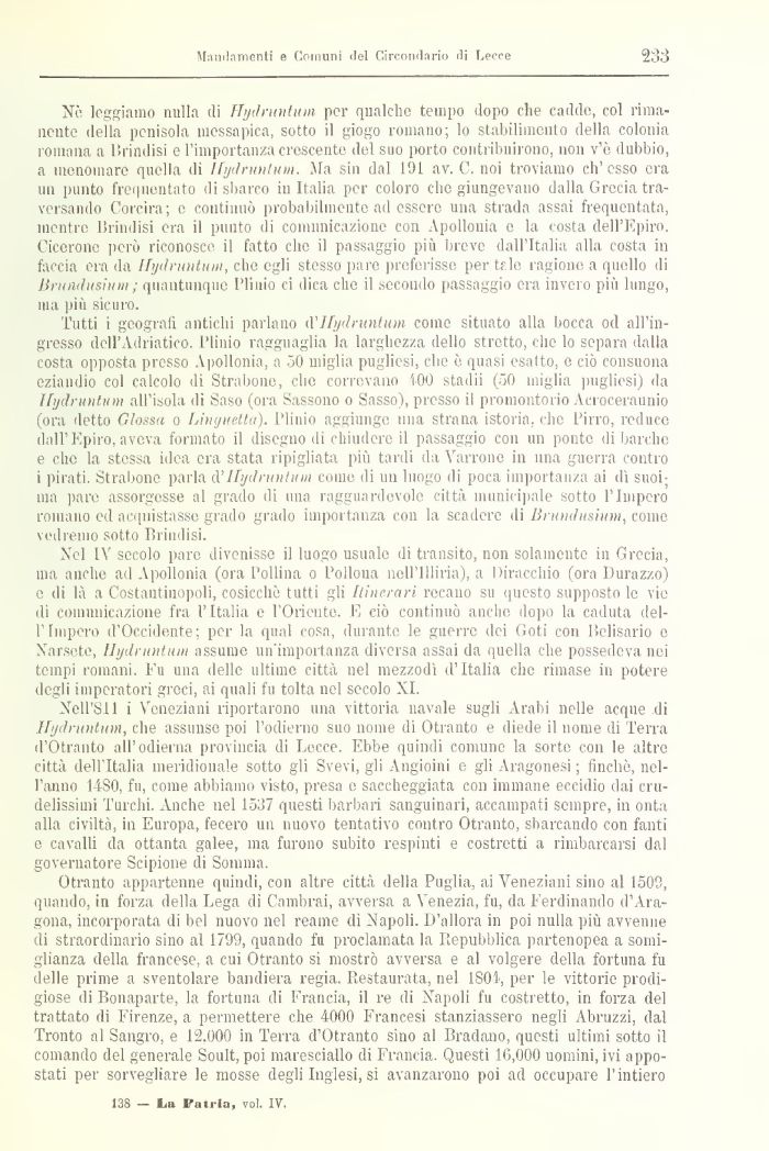 Nò leggiamo nulla (li fJydritntum per qualche tempo dopo che cadde, col rimanente della penisola messapica, sotto il giogo romano; lo stabilimento della colonia romana a Brindisi e l'importanza crescente del suo porto contribuirono, non v'ò dubbio, a menomare quella di Htfàrunlum. Ma sin dal 191 av. C. noi troviamo ch'esso era un punto frequentato di sbarco 111 Italia per coloro che giungevano dalla Grecia traversando Corcìra; e continuò probabilmente ad essere una strada assai frequentata, mentre Brindisi era il punto di comunicazione con Apollonia e la costa dell'Epiro. Cicerone però riconosce il fatto che il passaggio più breve dall'Italia alla costa in faccia era da Hijdnndum, che egli stesso pare preferisse per t?.le ragione a quello di Ihuìidus'nun; quantunque Plinio ci dica che il secondo passaggio era invero più lungo, 111 a più sicuro.