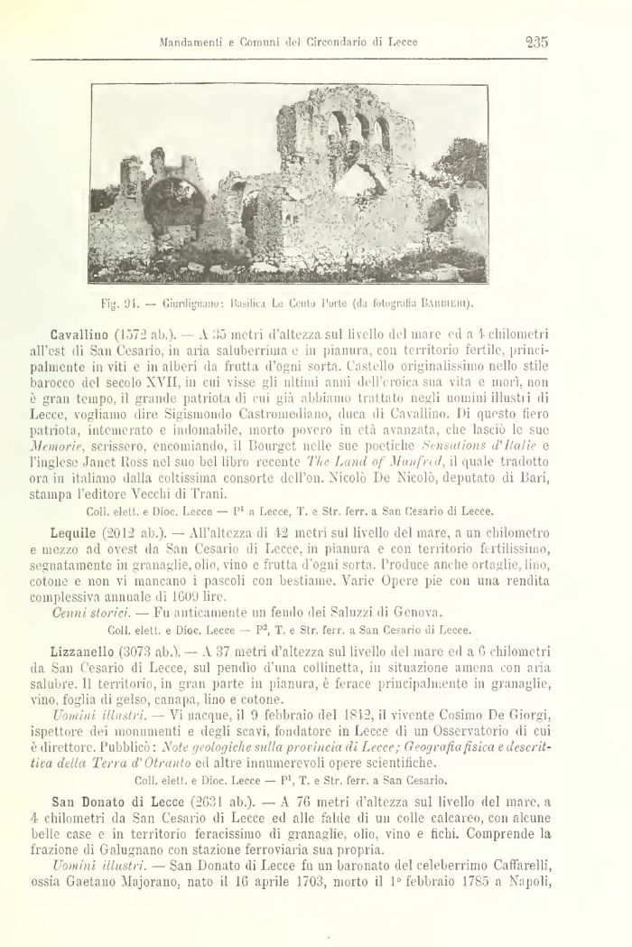 Cavallino (1572 ah.). :i5 inetri d'altezza sul livello del mai e ed a 1-chilometri all'est ili San Cesario, in aria saluberrima e In pianura, con territorio fertile, principalmente in viti e in alberi da frutta d'ogni sorta. Castello originalissimo nello stile barocco del secolo XVII, In cui visse gli ultimi anni dell'eroica sua vita e morì, non è gran tempo, il grande, patriota di cui già abbiamo trattato negli uomini illustri ili Lecce, vogliamo dire Sigismondo Castromediano, duca di Cavallino. Di questo fiero patriota, intemerato e indomabile, morto povero in età avanzata, che lasciò le sue Memorie, scrissero, encomiando, il Bourget nelle sue poetiche Scusaiioas d'Halle e l'inglese Janet Boss nel suo bel libro recente The Land of Manfrtd, il quale tradotto ora in italiano dalla coltissima consorte dell'ori. Nicolò Do Nicolò, deputato di Bari, stampa l'editore Vecchi di Traili.