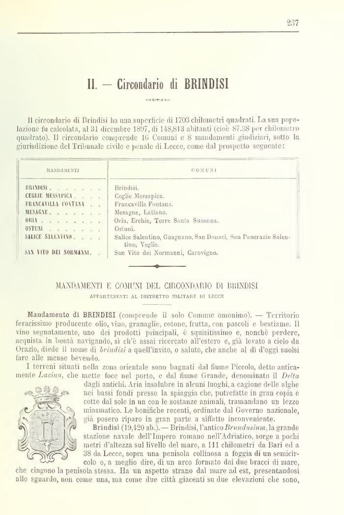 11 circondario di Brindisi ha una superficie di 1703 chilometri quadrati. La sua popolazione fu calcolata, al 31 dicembre 1897, dì 148,813 abitanti (cioè 87.3S per chilometro quadrato). Il circondario comprende 1G Comuni e 8 mandamenti giudiziari, sotto la giurisdizione del Tribunale ci\ile e penale di Lecce, come dal prospetto seguente: