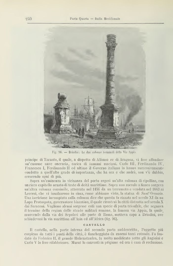 Sopra un'eminenza in vicinanza del porto ergesi un'alta colonna di cipollino, con un ricco capitello ornato di teste di deità marittimo. Sopra uno zoccolo a fianco sorgeva un'altra colonna consimile, atterrata nel 115G da un terremoto e venduta nel 1003 ai Leccesi, die vi innalzarono in cima, come abbiamo visto, la statua di SanCOronzio. Una iscrizione incompiuta sulla colonna dice che questa fu rizzata nel secolo XI da un Lupa l'rotospata, governatore bisantino, il quale ricostruì la città distrutta nel secolo X dai Saraceni. Vogliono alcuni sorgesse colà una specie di porta trionfale, che segnava il te nume della regina delle strade militari romane, la famosa via Vppia, la quale, muovendo dalla via dei Sepolcri alle porte di I'ouia, metteva capo a Brindisi, ove schiudevasi la via marittima all'Asia ed all'Africa (fig. 'JG).