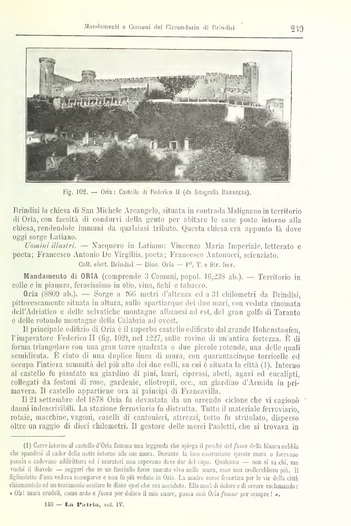 11 principale edifizio di Oria è il superbo castello edificato dal grande Hohenstaufen, l'imperatore Federico II (fig. 102), nel 1227, sulle rovino di un'antica fortezza. È di forma triangolare con una gran torre quadrata e due piccole rotonde, una delle quali seiuidiruta. E cinto di una duplice linea di mura, con quarantacinque torricelle ed occupa l'intiera sommità del più alto dei due colli, su cui è situata la città (1). Intorno al castello fu piantato un giardino di pini, lauri, cipressi, abeti, agavi ed eucalipti, collegati da festoni di rose, gardenie, eliotropii, ecc., un giardino d'Armida in primavera. Il castello appartiene ora ai principi di Francavilla.