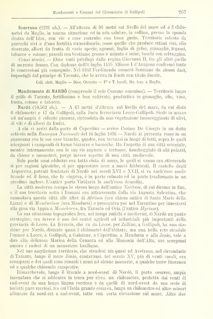 Scorrano (2231 ab.). —All'altezza (li 95 metri sul livello del mare ed a 3 chilometri da Maglie, in amena situazione ed in aria salubre, in collina, presso la sponda destra dell' Idro, con vie e case costruite con buon gusto. Territorio solcato da parecchi rivi e d'ima fertilità straordinaria, come quello clic produce ottimi vini, olio ricercato, alberi da frutta di varie specie, agrumi, foglia di gelso, granaglie, legumi, tabacco e cotone; pascoli con bestiame grosso e minuto e suini; boschi con selvaggina.